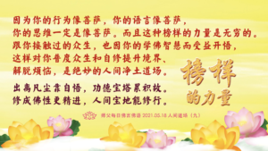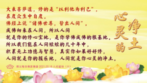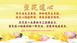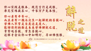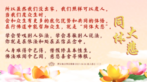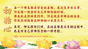 举个例子,如果想考大学,必须从小学、初中、高中一步一步走过来,最后才有机会考大学。这就是台长为什么跟大家说,做人要从人间做起。很多人以为,我学了这个法门,我以后可以直接上天,这种想法太幼稚。要记住,一栋房子是靠一块一块砖头堆砌起来的,人的智慧也是靠积累的,功德也是靠做的,没有任何一个法门可以让你一步登天。……犹如现在的孩子要考上大学,他必须拿他平时的分数,加上最后考试的成绩,而不仅仅是凭考大学那一次的成绩就可以上大学。大家明白了这个道理,修心就不难了。