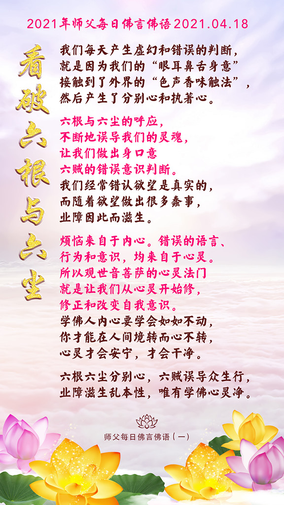 我们每天产生虚幻和错误的判断,就是因为我们的“眼耳鼻舌身意”接触到了外界的“色声香味触法”,然后产生了分别心和执著心。