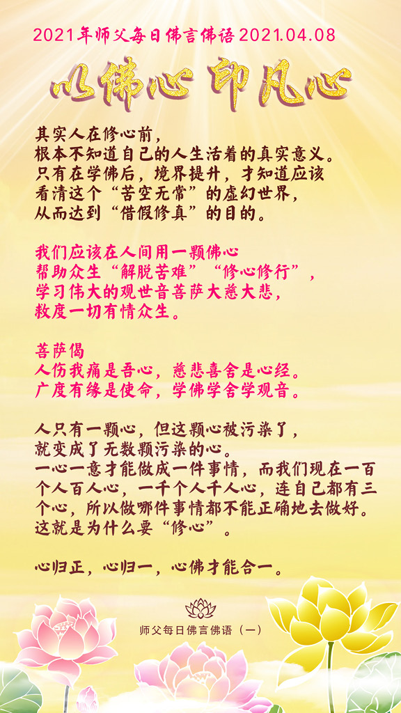 我们应该在人间用一颗佛心帮助众生“解脱苦难”“修心修行”,学习伟大的观世音菩萨大慈大悲,救度一切有情众生。