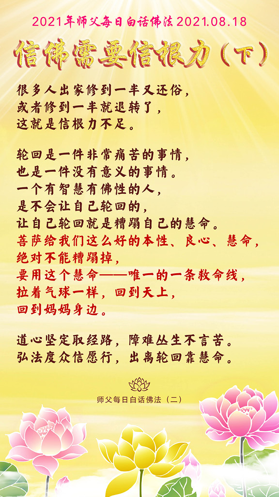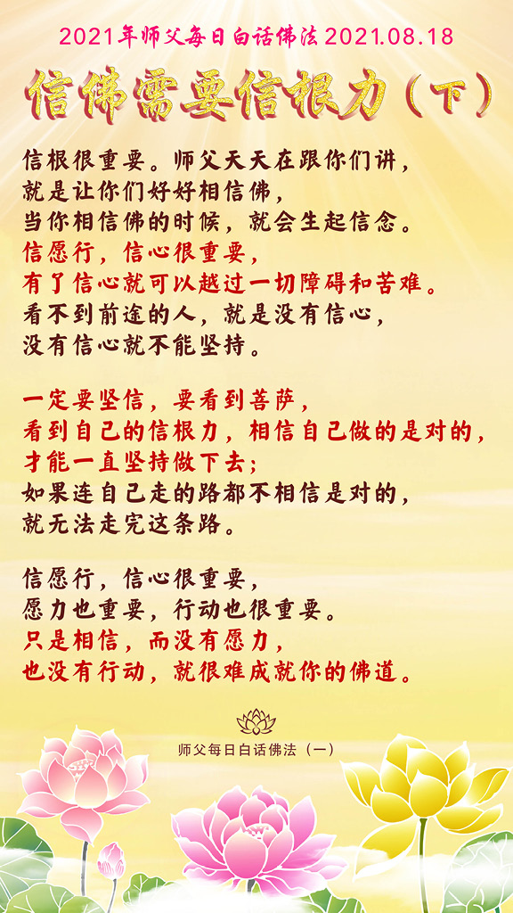 信根很重要。师父天天在跟你们讲,就是让你们好好相信佛,当你相信佛的时候,就会生起信念。信愿行,信心很重要,有了信心就可以越过一切障碍和苦难。看不到前途的人,就是没有信心,没有信心就不能坚持。