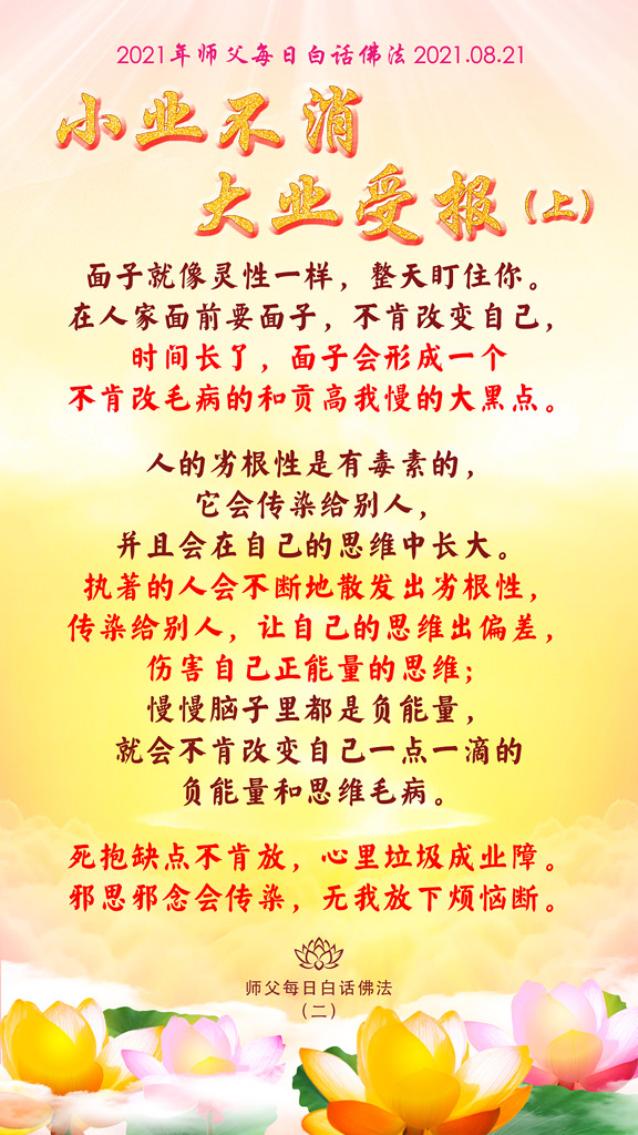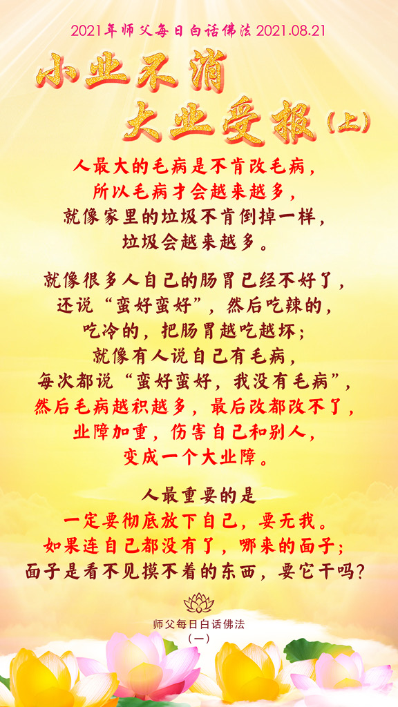 就像很多人自己的肠胃已经不好了,还说“蛮好蛮好”,然后吃辣的,吃冷的,把肠胃越吃越坏;就像有人说自己有毛病,每次都说“蛮好蛮好,我没有毛病”,然后毛病越积越多,最后改都改不了,业障加重,伤害自己和别人,变成一个大业障。