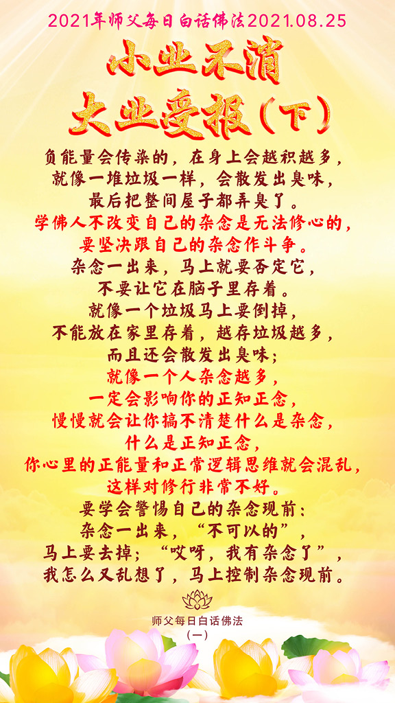 负能量会传染的,在身上会越积越多,就像一堆垃圾一样,会散发出臭味,最后把整间屋子都弄臭了。学佛人不改变自己的杂念是无法修心的,要坚决跟自己的杂念作斗争。杂念一出来,马上就要否定它,不要让它在脑子里存着。就像一个垃圾马上要倒掉,不能放在家里存着,越存垃圾越多,而且还会散发出臭味;就像一个人杂念越多,一定会影响你的正知正念,慢慢就会让你搞不清楚什么是杂念,什么是正知正念,你心里的正能量和正常逻辑思维就会混乱,这样对修行非常不好。要学会警惕自己的杂念现前:杂念一出来,“不可以的”,马上要去掉;“哎呀,我有杂念了,我怎么又乱想了”,马上控制杂念现前。