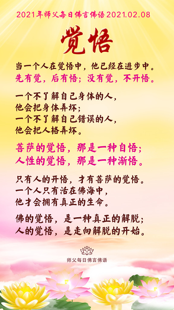 师父每日佛言佛语 2021年师父每日佛言佛语|2021年2月8日《觉悟》 08/02/2021 | 师父每日佛言佛语 师父每日佛言佛语 <师父每日佛言佛语 《觉悟》 当一个人在觉悟中, 他已经在进步中。 先有觉,后有悟; 没有觉,不开悟。 一个不了解自己身体的人,他会把身体弄坏; 一个不了解自己错误的人,他会把人格弄坏。 菩萨的觉悟,那是一种自悟; 人性的觉悟,那是一种渐悟。 只有人的开悟,才有菩萨的觉悟。 一个人只有活在佛海中,他才会拥有真正的生命。 佛的觉悟,是一种真正的解脱; 人的觉悟,是走向解脱的开始。 <师父每日佛言佛语