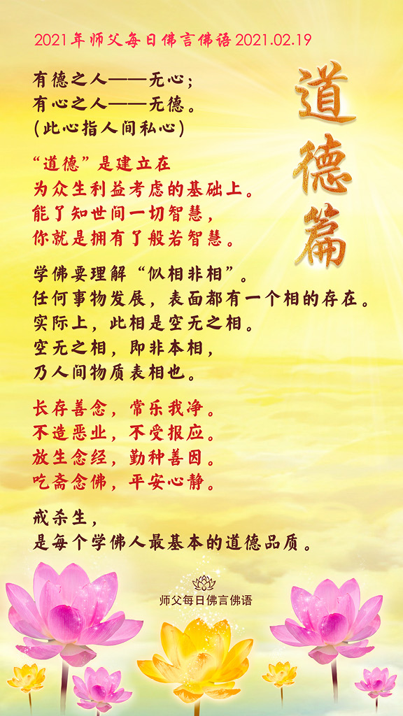师父每日佛言佛语 2021年师父每日佛言佛语|2021年2月19日《道德篇》 19/02/2021 | 师父每日佛言佛语 师父每日佛言佛语 <师父每日佛言佛语 《道德篇》 有德之人——无心; 有心之人——无德。(此心指人间私心) “道德”是建立在为众生利益考虑的基础上。 能了知世间一切智慧,你就是拥有了般若智慧。 学佛要理解“似相非相”。 任何事物发展,表面都有一个相的存在。 实际上,此相是空无之相。 空无之相,即非本相,乃人间物质表相也。 长存善念,常乐我净。 不造恶业,不受报应。 放生念经,勤种善因。 吃斋念佛,平安心静。 戒杀生,是每个学佛人最基本的道德品质。 <师父每日佛言佛语