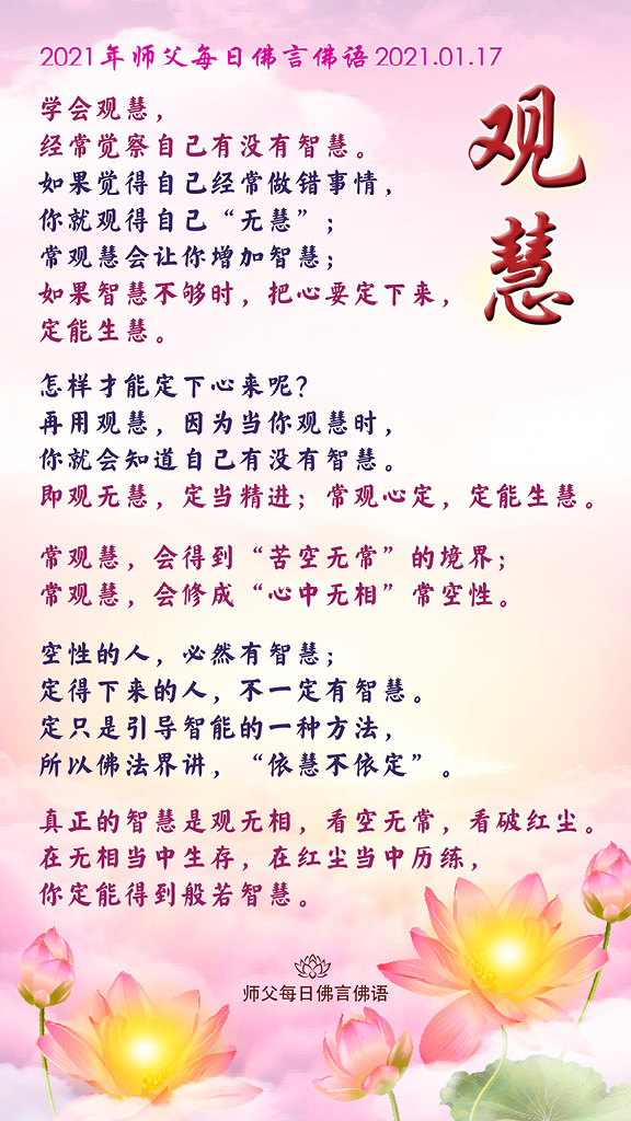 学会观慧,经常觉察自己有没有智慧。如果觉得自己经常做错事情,你就观得自己“无慧”;常观慧会让你增加智慧;如果智慧不够时,把心要定下来,定能生慧。