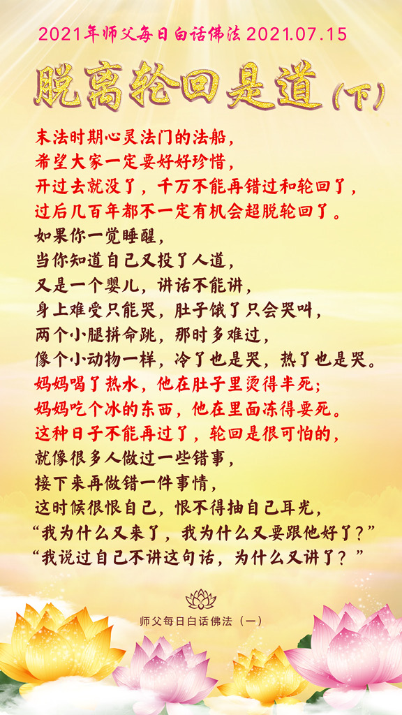 如果你一觉睡醒,当你知道自己又投了人道,又是一个婴儿,讲话不能讲,身上难受只能哭,肚子饿了只会哭叫,两个小腿拼命跳,那时多难过,像个小动物一样,冷了也是哭,热了也是哭。妈妈喝了热水,他在肚子里烫得半死;妈妈吃个冰的东西,他在里面冻得要死。这种日子不能再过了,轮回是很可怕的,就像很多人做过一些错事,接下来再做错一件事情,这时候很恨自己,恨不得抽自己耳光,“我为什么又来了,我为什么又要跟他好了?”“我说过自己不讲这句话,为什么又讲了?”