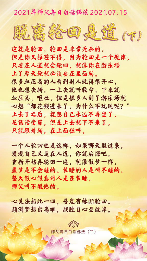 这就是轮回,轮回是非常无奈的,但是你又躲避不得,因为轮回是一个规律,只要在人道就会轮回,就像你在游乐场上了摩天轮就必须要在里面转。