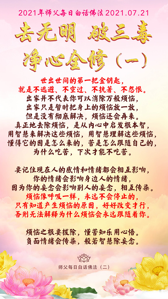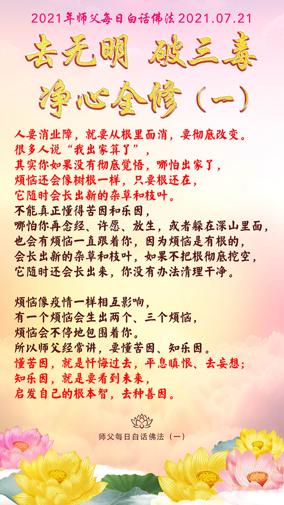 烦恼像疫情一样相互影响,有一个烦恼会生出两个、三个烦恼,烦恼会不停地包围着你。所以师父经常讲,要懂苦因、知乐因。懂苦因,就是忏悔过去,平息瞋恨、去妄想;知乐因,就是要看到未来,启发自己的根本智,去种善因。