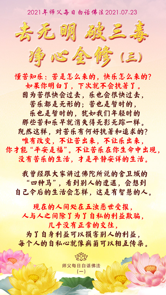 懂苦知乐:苦是怎么来的,快乐怎么来的?如果你明白了,下次就不会执著了。因为苦很快会过去,乐也会很快过去,苦乐都是无形的;苦也是暂时的,乐也是暂时的,犹如我们年轻时的那些苦和乐早就消失得无影无踪一样。既然这样,对苦乐有何好执著和追求的?唯有改变,不让苦出来,不让乐出来,你才能“平安是福”。不让苦乐在你生命中出现,没有苦乐的生活,才是平静安详的生活。