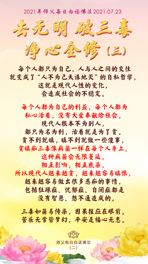 每个人都为自己的利益,每个人都为私心活着,没有大爱奉献给社会,现代人根本不为别人,都只为名为利,活着就是为了贪,贪不到就瞋,瞋不到就做一些傻事,贪瞋痴三毒像病菌一样在每个人身上,这种病菌会无限蔓延,相互影响,相互感染,所以现代人越来越贪,越来越容易瞋恨,越来越容易做出很多愚痴的事情,包括狂躁症、忧郁症、自闭症都是没有智慧、想不通造成的。