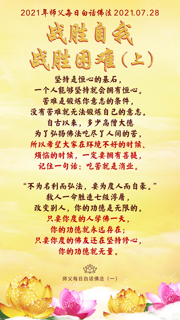 坚持是恒心的基石,一个人能够坚持就会拥有恒心。苦难是锻炼你意志的条件,没有苦难就无法锻炼自己的意志。自古以来,多少高僧大德为了弘扬佛法吃尽了人间的苦,所以希望大家在环境不好的时候、烦恼的时候,一定要拥有菩提,记住一句话:吃苦就是消业。