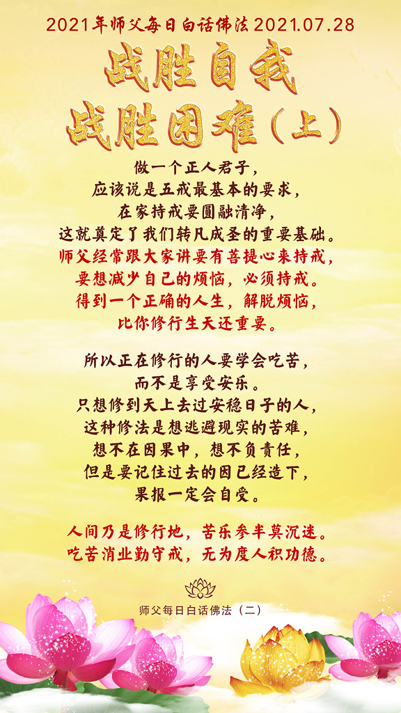 所以正在修行的人要学会吃苦,而不是享受安乐。只想修到天上去过安稳日子的人,这种修法是想逃避现实的苦难,想不在因果中,想不负责任,但是要记住过去的因已经造下,果报一定会自受。