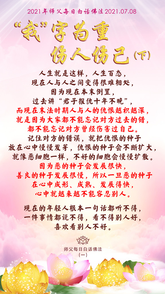 人生就是这样,人生百态,现在人与人之间变得很难相处,因为现在本末倒置,过去讲“君子报仇十年不晚”,而现在末法时期人与人的仇恨越积越深,就是因为大家都不能忘记对方过去的错,都不能忘记对方曾经伤害过自己。记住对方的错误,就把仇恨的种子放在心中慢慢发芽,仇恨的种子会不断扩大,就像恶细胞一样,不好的细胞会慢慢扩散。因为恶的种子会发展很快,善良的种子发展很慢,所以一旦恶的种子在心中成形、成熟、发展得快,心中就越来越不能容忍别人。