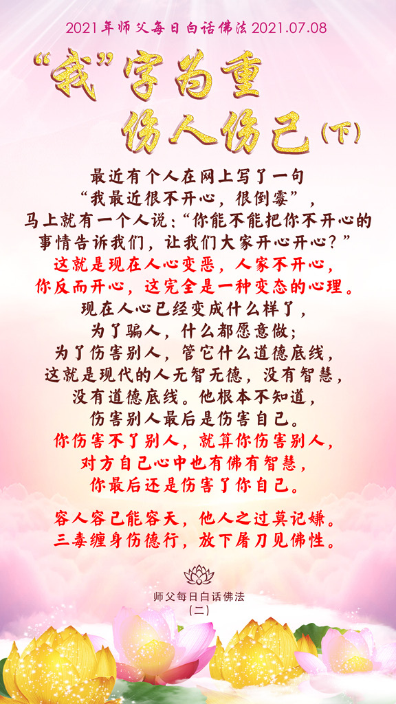 现在的年轻人根本一句话都听不得,一件事情都说不得,看不得别人好,喜欢看别人不好。最近有个人在网上写了一句“我最近很不开心,很倒霉”,马上就有一个人说:“你能不能把你不开心的事情告诉我们,让我们大家开心开心?”这就是现在人心变恶,人家不开心,你反而开心,这完全是一种变态的心理。现在人心已经变成什么样了,为了骗人,什么都愿意做;为了伤害别人,管它什么道德底线,这就是现代的人无智无德,没有智慧,没有道德底线。他根本不知道,伤害别人最后是伤害自己。你伤害不了别人,就算你伤害别人,对方自己心中也有佛有智慧,你最后还是伤害了你自己。