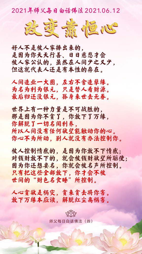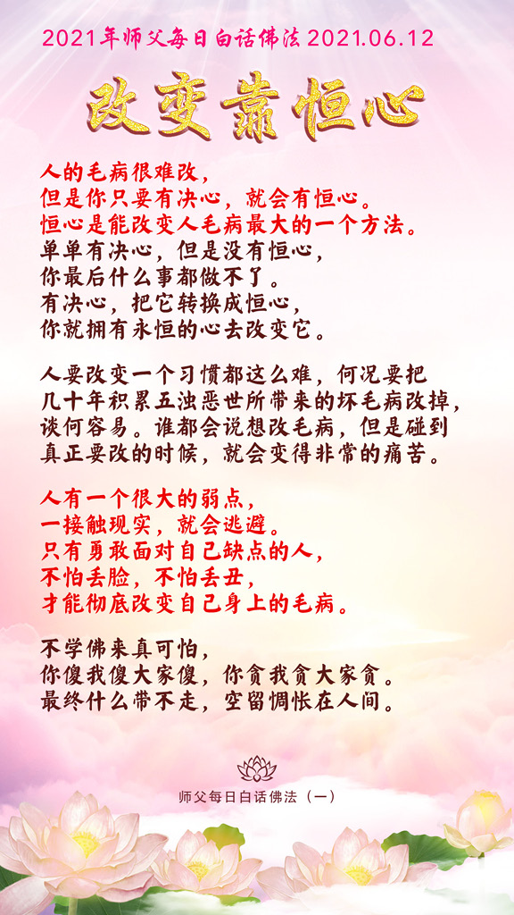 人要改变一个习惯都这么难,何况要把几十年积累五浊恶世所带来的坏毛病改掉,谈何容易。谁都会说想改毛病,但是碰到真正要改的时候,就会变得非常的痛苦。