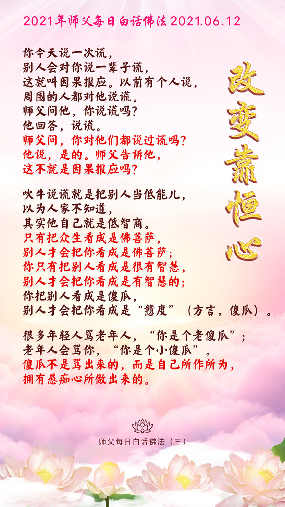 吹牛说谎就是把别人当低能儿,以为人家不知道,其实他自己就是低智商。只有把众生看成是佛菩萨,别人才会把你看成是佛菩萨;你只有把别人看成是很有智慧,别人才会把你看成是有智慧的;你把别人看成是傻瓜,别人才会把你看成是“戆度”(方言,傻瓜)。