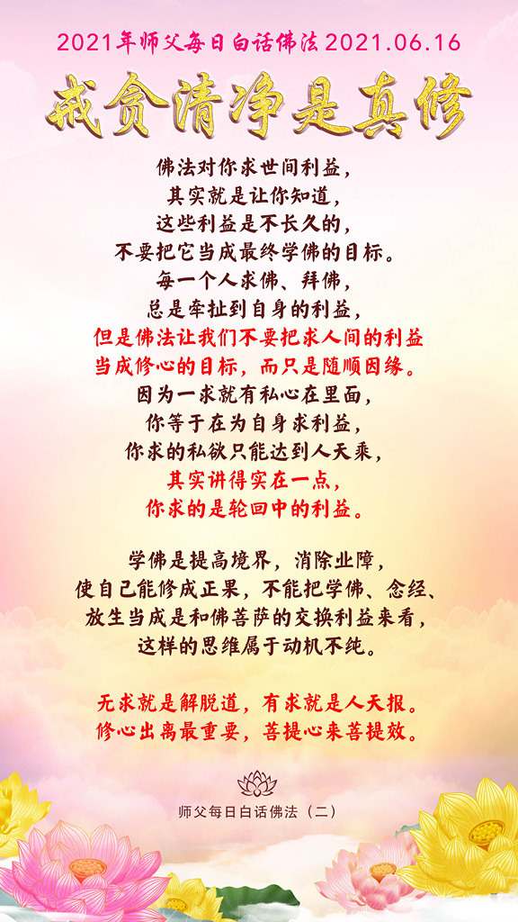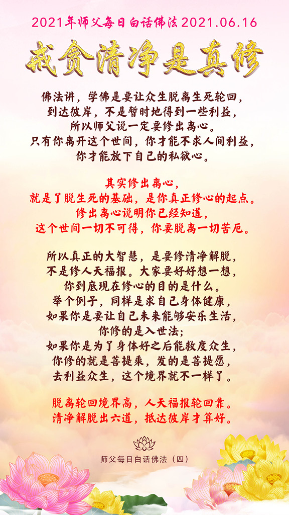 佛法讲,学佛是要让众生脱离生死轮回,到达彼岸,不是暂时地得到一些利益,所以师父说一定要修出离心。只有你离开这个世间,你才能不求人间利益,你才能放下自己的私欲心。