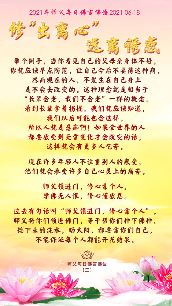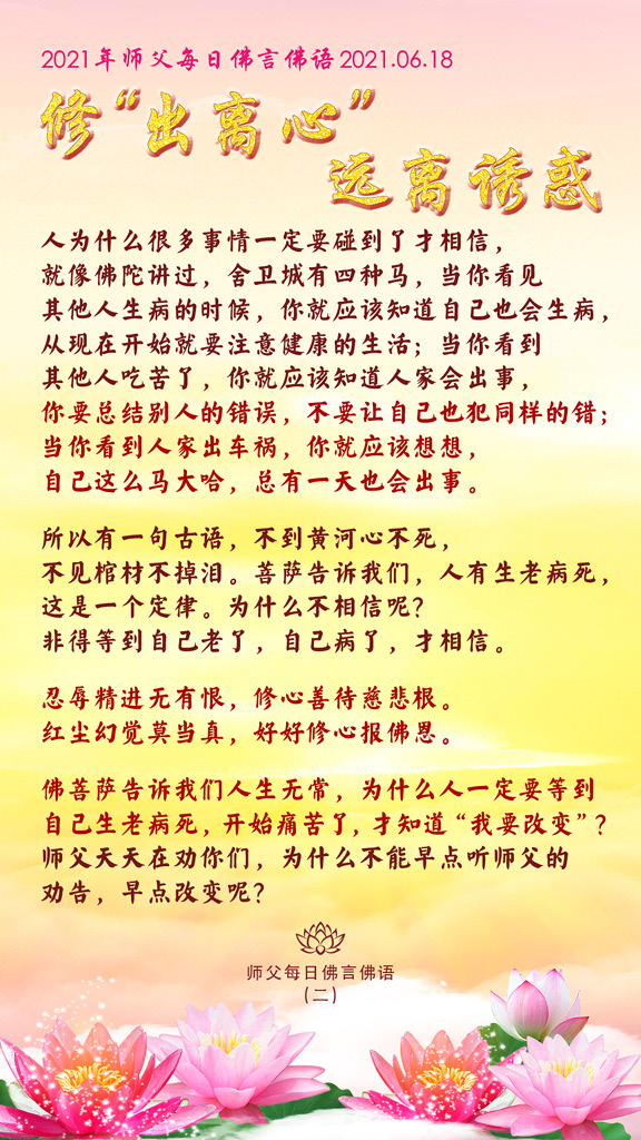 佛菩萨告诉我们人生无常,为什么人一定要等到自己生老病死,开始痛苦了,才知道“我要改变”?师父天天在劝你们,为什么不能早点听师父的劝告,早点改变呢?