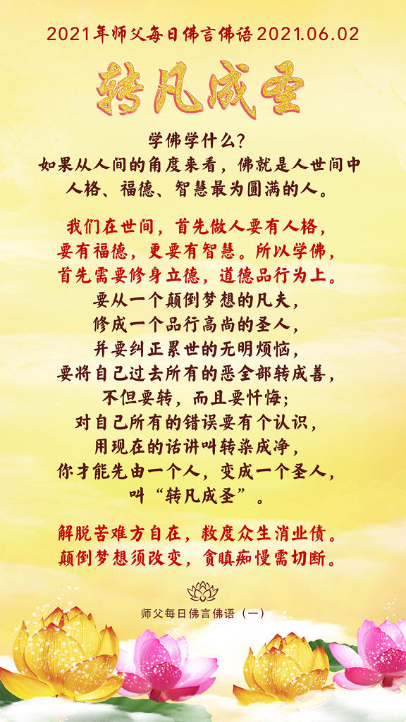 我们在世间,首先做人要有人格,要有福德,更要有智慧。所以学佛,首先需要修身立德,道德品行为上。要从一个颠倒梦想的凡夫,修成一个品行高尚的圣人,并要纠正累世的无明烦恼,要将自己过去所有的恶全部转成善,不但要转,而且要忏悔;对自己所有的错误要有个认识,用现在的话讲叫转染成净,你才能先由一个人,变成一个圣人,叫“转凡成圣”。