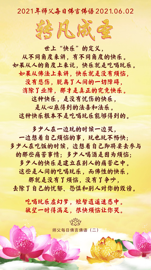 多少人在一边玩的时候一边哭,一边想着自己烦恼的事,玩也玩不畅快;多少人在吃饭的时候,边想着自己即将要去参与的那些痛苦事情;多少人喝酒是因为烦恼;多少人的快乐是建立在别人的痛苦之中。这些是人间的吃喝玩乐,而佛性的快乐,那就是没有了烦恼,没有了争吵,去除了自己的忧郁、恐惧和别人对你的毁谤。