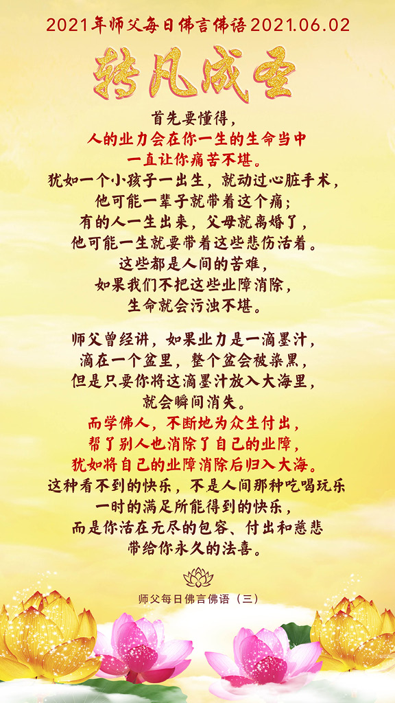 师父曾经讲,如果业力是一滴墨汁,滴在一个盆里,整个盆会被染黑,但是只要你将这滴墨汁放入大海里,就会瞬间消失。而学佛人,不断地为众生付出,帮了别人也消除了自己的业障,犹如将自己的业障消除后归入大海。这种看不到的快乐,不是人间那种吃喝玩乐一时的满足所能得到的快乐,而是你活在无尽的包容、付出和慈悲带给你永久的法喜。