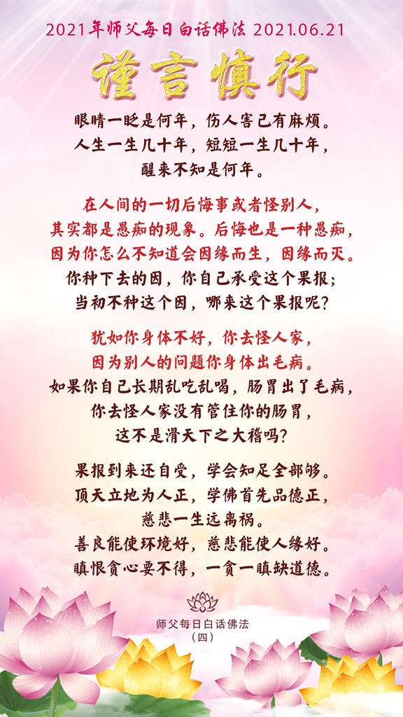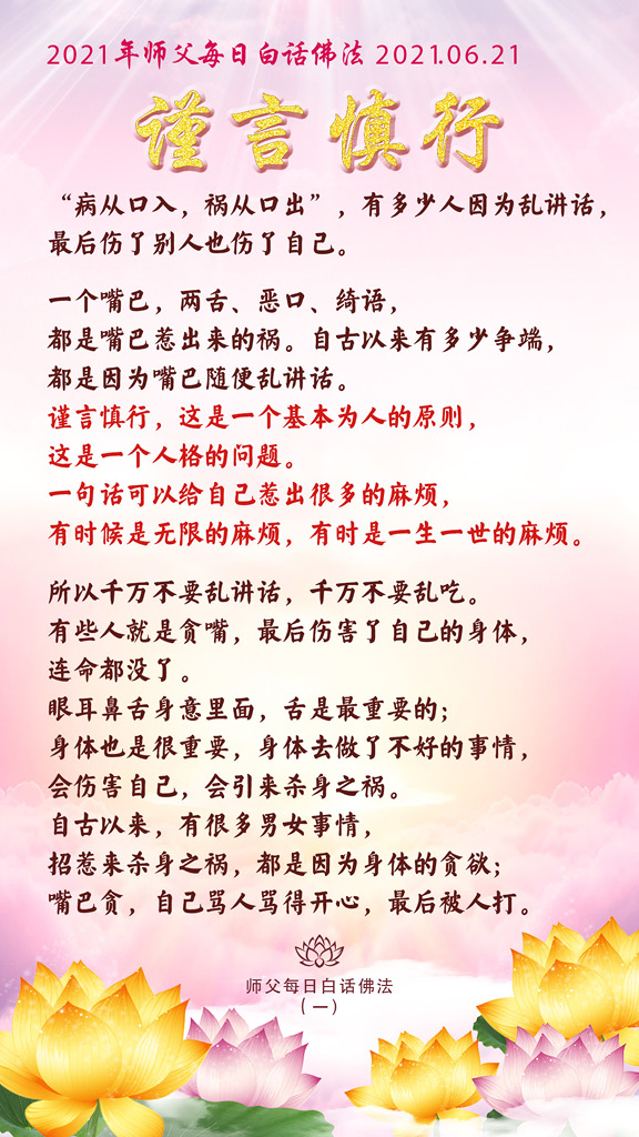 所以千万不要乱讲话,千万不要乱吃。有些人就是贪嘴,最后伤害了自己的身体,连命都没了。眼耳鼻舌身意里面,舌是最重要的;身体也是很重要,身体去做了不好的事情,会伤害自己,会引来杀身之祸。