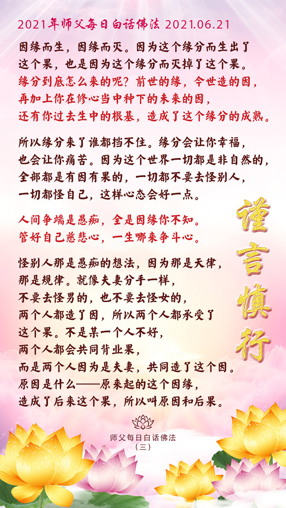 因缘而生,因缘而灭。因为这个缘分而生出了这个果,也是因为这个缘分而灭掉了这个果。缘分到底怎么来的呢?前世的缘,今世造的因,再加上你在修心当中种下的未来的因,还有你过去生中的根基,造成了这个缘分的成熟。