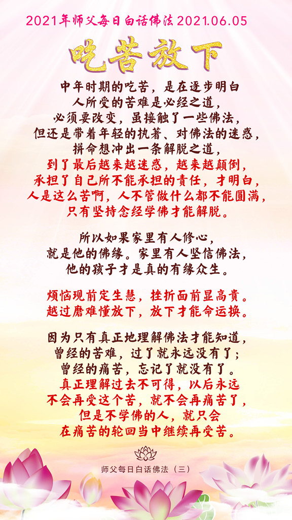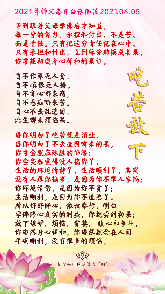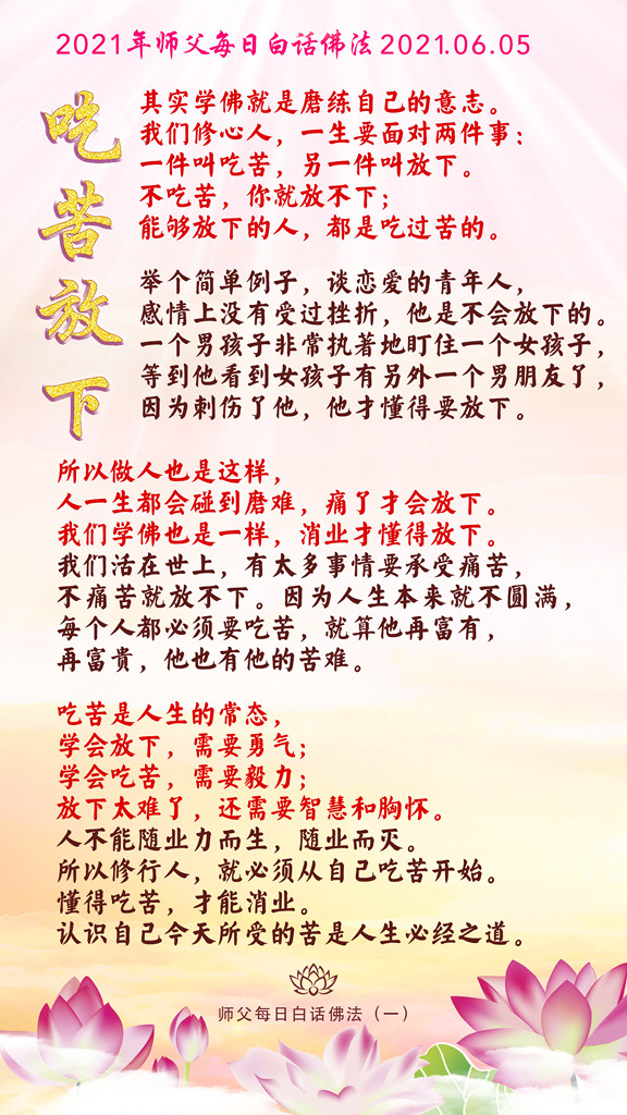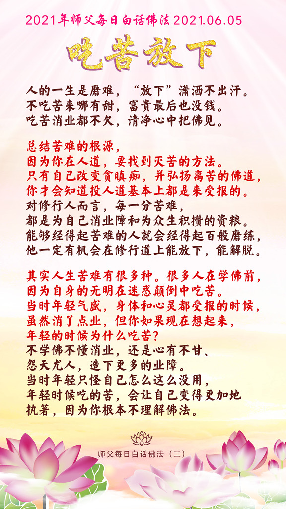 懂得吃苦,才能消业。认识自己今天所受的苦是人生必经之道。