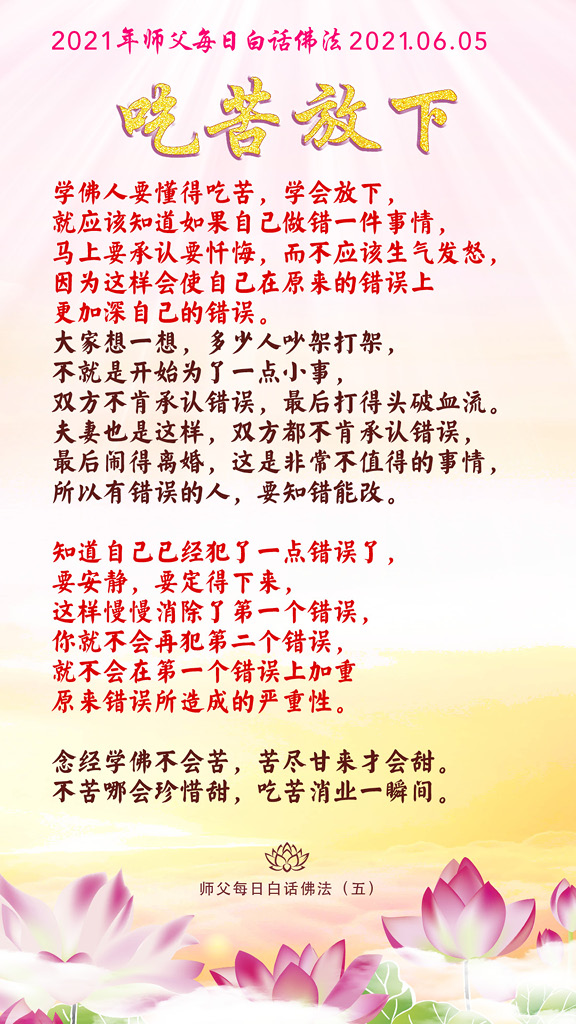 学佛人要懂得吃苦,学会放下,就应该知道如果自己做错一件事情,马上要承认要忏悔,而不应该生气发怒,因为这样会使自己在原来的错误上更加深自己的错误。大家想一想,多少人吵架打架,不就是开始为了一点小事,双方不肯承认错误,最后打得头破血流。夫妻也是这样,双方都不肯承认错误,最后闹得离婚,这是非常不值得的事情,所以有错误的人,要知错能改。