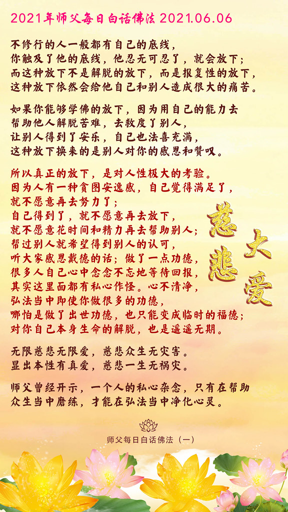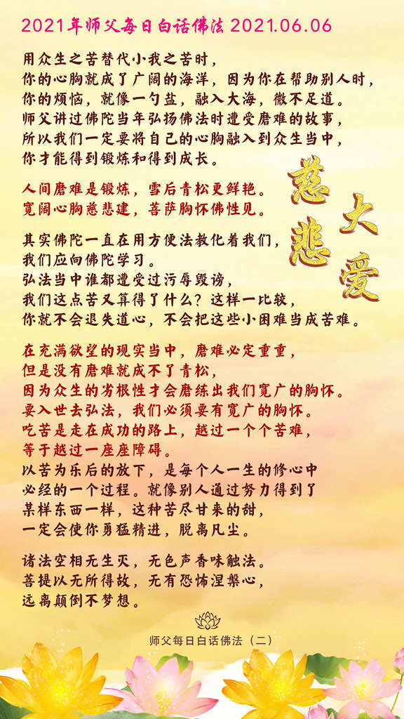 师父曾经开示,一个人的私心杂念,只有在帮助众生当中磨练,才能在弘法当中净化心灵。用众生之苦替代小我之苦时,你的心胸就成了广阔的海洋,因为你在帮助别人时,你的烦恼,就像一勺盐,融入大海,微不足道。师父讲过佛陀当年弘扬佛法时遭受磨难的故事,所以我们一定要将自己的心胸融入到众生当中,你才能得到锻炼和得到成长。