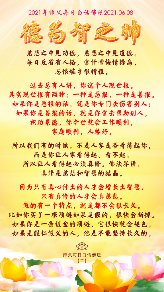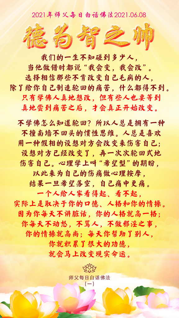 一个人给人家看得起、看不起,实际上是取决于你的口德、人格和你的情操。因为你每天不讲脏话,你的人格就高一格;你每天不动怒,不骂人,不做邪淫之事,你的情操就高尚;每天你帮助了别人,你就积累了很大的功德,就会马上改变现实命运。