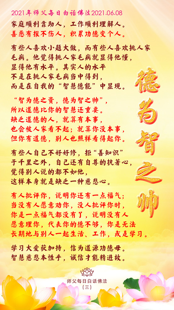 有些人喜欢小题大做,而有些人喜欢挑人家毛病。他觉得挑人家毛病就显得他懂,显得他有水平。其实人的水平不是在挑人家毛病当中得到,而是在自我的“智慧德能”中显现。