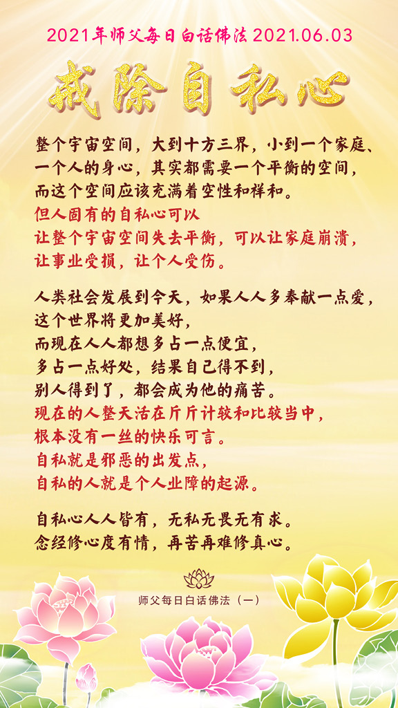所以真正地想在人间得到自在与快乐,首先要去除自私心,你才能与天地合一,与佛合一,才能拥有天地之德。
