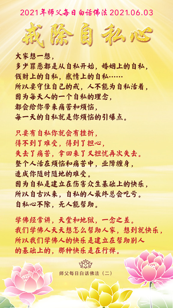 因为自私是建立在伤害众生基础上的快乐,所以自古以来,自私的人最终总会吃亏。自私心不除,无人能帮助。