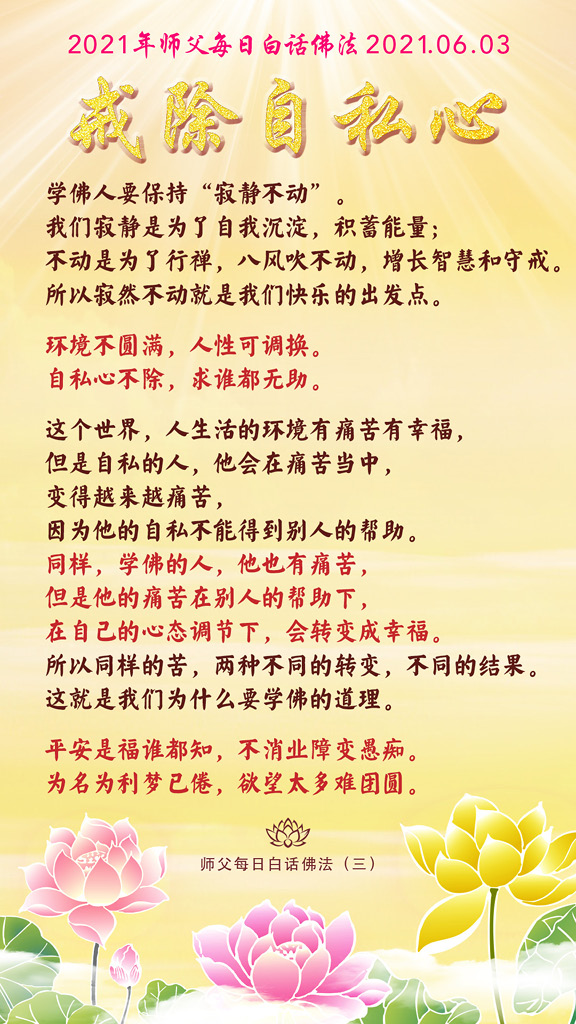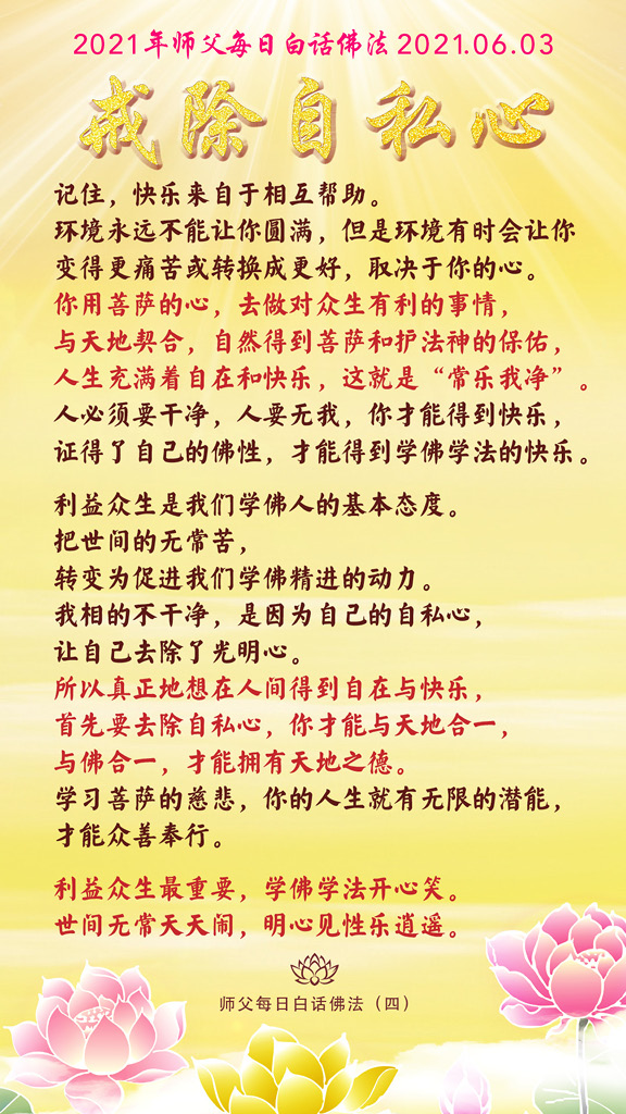利益众生是我们学佛人的基本态度。把世间的无常苦,转变为促进我们学佛精进的动力。我相的不干净,是因为自己的自私心,让自己去除了光明心。