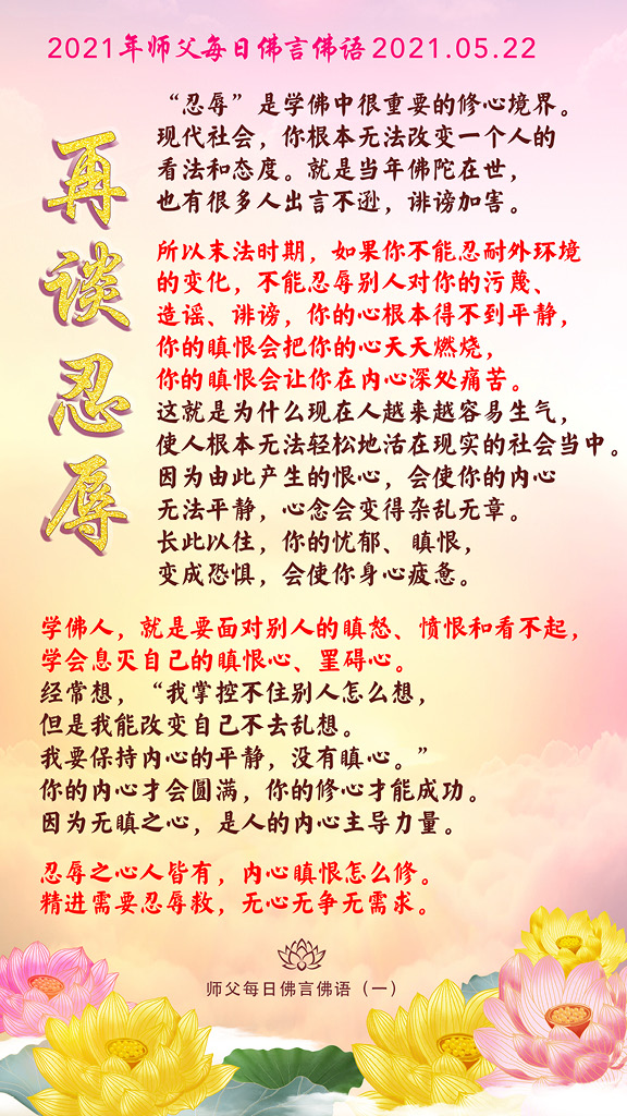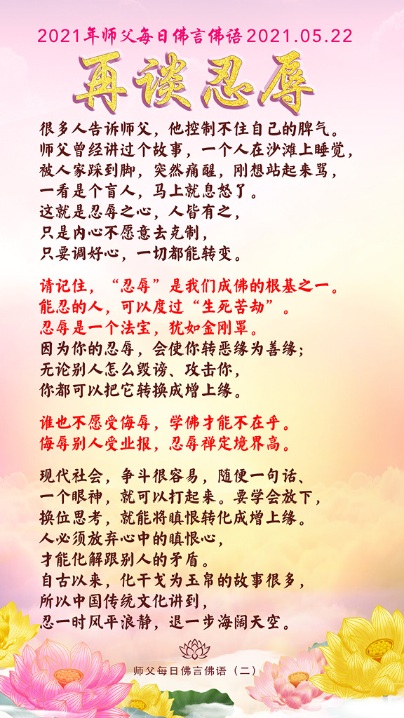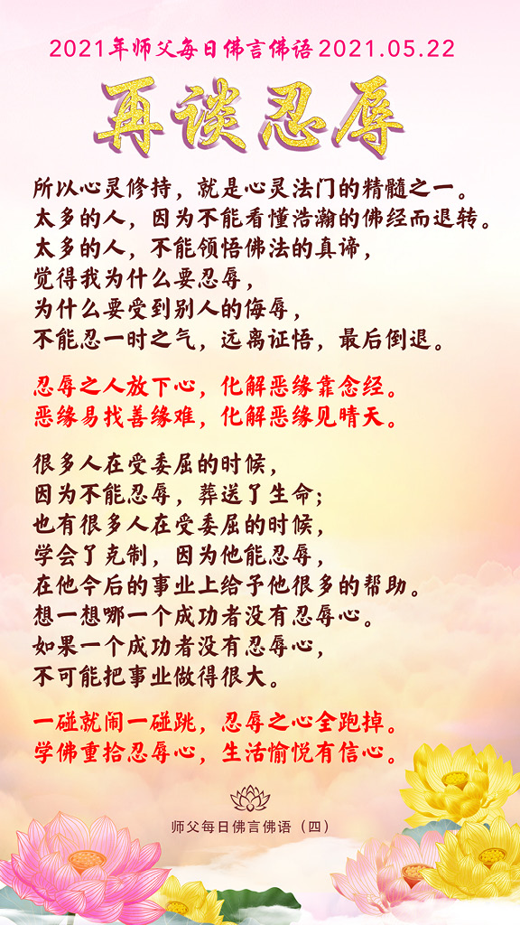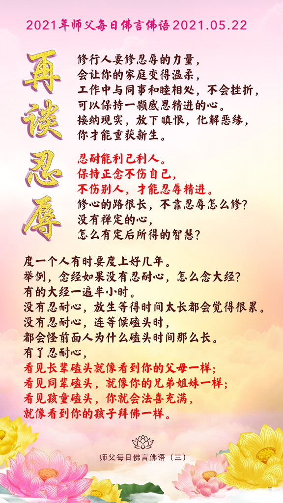 修行人要修忍辱的力量,会让你的家庭变得温柔,工作中与同事和睦相处,不会挫折,可以保持一颗感恩精进的心。接纳现实,放下瞋恨,化解恶缘,你才能重获新生。