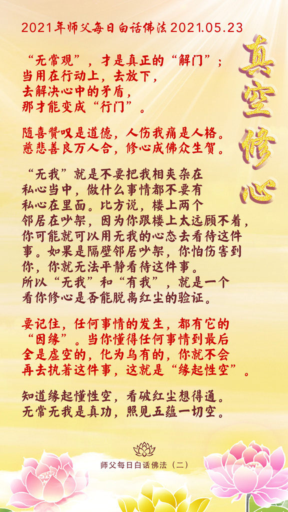 学习师父讲法,真心对人,才能感动他人;慈悲待人,才能动人心性。用纯洁善良的感情弘法,说明你天真无邪,朴实无虚,这才被称为去我相“真空修心”。