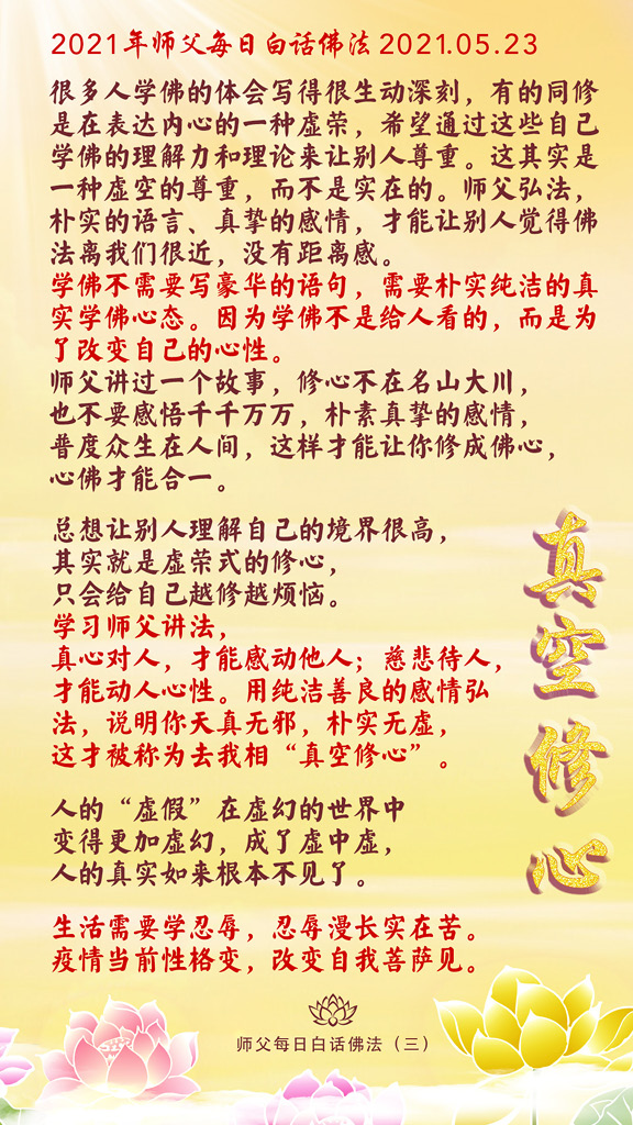 很多人学佛的体会写得很生动深刻,有的同修是在表达内心的一种虚荣,希望通过这些自己学佛的理解力和理论来让别人尊重。这其实是一种虚空的尊重,而不是实在的。师父弘法,朴实的语言、真挚的感情,才能让别人觉得佛法离我们很近,没有距离感。
