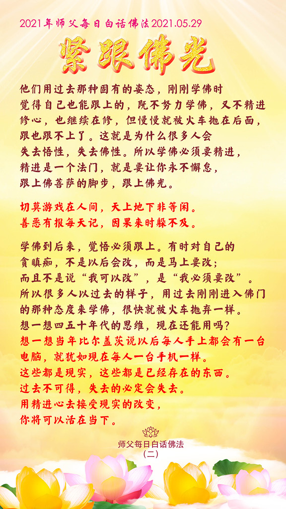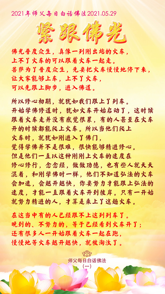 在这当中有的人已经跟不上这列列车了。晚到的、不努力的,等于已经看到火车开了;还有很多人一开始跟着火车一起在跑,慢慢地等火车越开越快,就被淘汰了。他们用过去那种固有的姿态,刚刚学佛时觉得自己也能跟上的,既不努力学佛,又不精进修心,也继续在修,但慢慢就被火车抛在后面,跟也跟不上了。这就是为什么很多人会失去悟性,失去佛性。所以学佛必须要精进,精进是一个法门,就是要让你永不懈怠,跟上佛菩萨的脚步,跟上佛光。