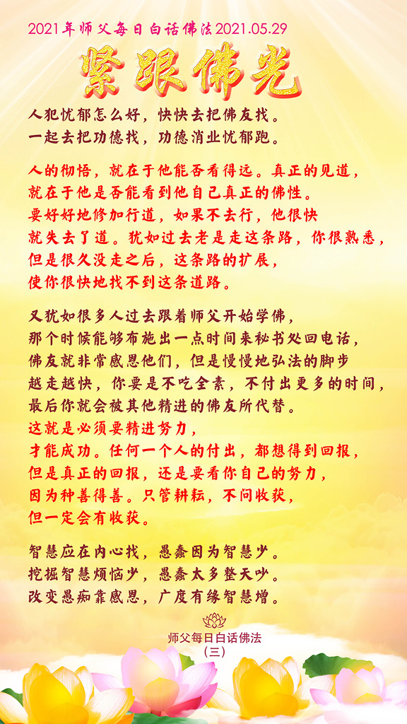 又犹如很多人过去跟着师父开始学佛,那个时候能够布施出一点时间来秘书处回电话,佛友就非常感恩他们,但是慢慢地弘法的脚步越走越快,你要是不吃全素,不付出更多的时间,最后你就会被其他精进的佛友所代替。这就是必须要精进努力,才能成功。任何一个人的付出,都想得到回报,但是真正的回报,还是要看你自己的努力,因为种善得善。只管耕耘,不问收获,但一定会有收获。