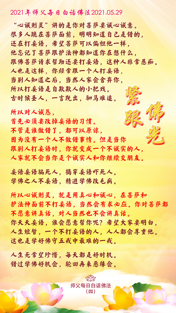 “心诚则灵”讲的是你对菩萨要诚心诚意。很多人跪在菩萨面前,明明知道自己是错的,还在打妄语,希望菩萨可以偏袒他一样,他忘记了菩萨跟护法神都知道你在想什么,跟佛菩萨请求帮助还要打妄语,这种人非常愚痴。