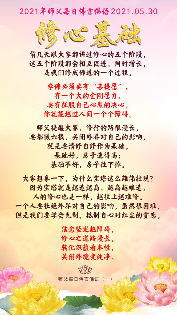 前几天跟大家都讲过修心的五个阶段,这五个阶段都会相互促进,同时增长,是我们修成佛道的一个过程。学佛必须要有“菩提愿”,有一个大的金刚愿力,要有征服自己心魔的决心,你就能越过人间一个个障碍。