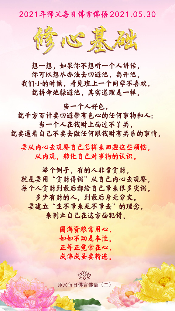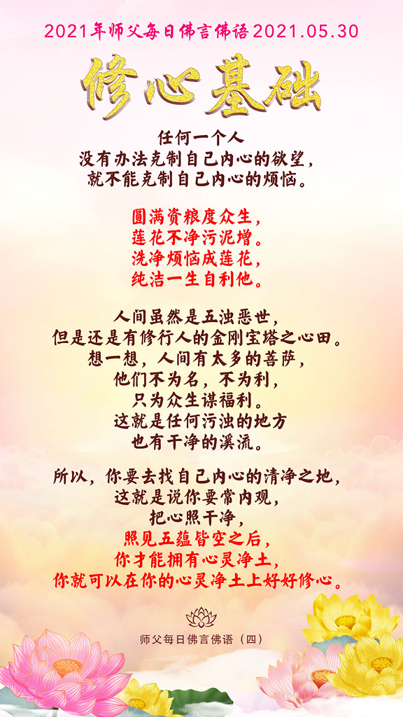 所以,你要去找自己内心的清净之地,这就是说你要常内观,把心照干净,照见五蕴皆空之后,你才能拥有心灵净土,你就可以在你的心灵净土上好好修心。