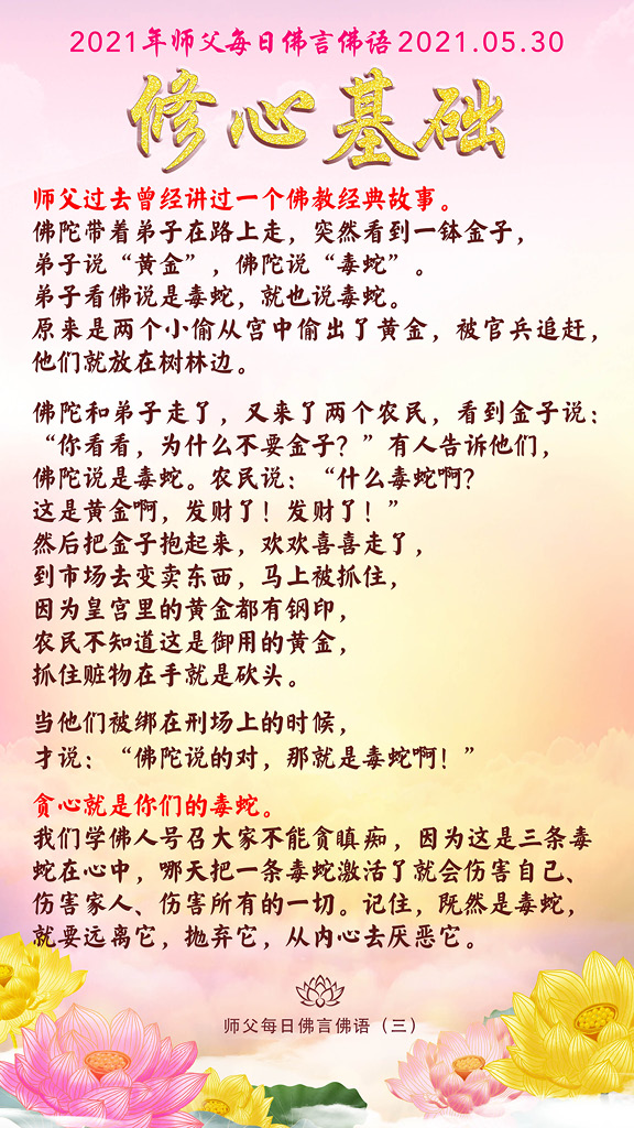 师父过去曾经讲过一个佛教经典故事。佛陀带着弟子在路上走,突然看到一钵金子,弟子说“黄金”,佛陀说“毒蛇”。弟子看佛说是毒蛇,就也说毒蛇。原来是两个小偷从宫中偷出了黄金,被官兵追赶,他们就放在树林边。
