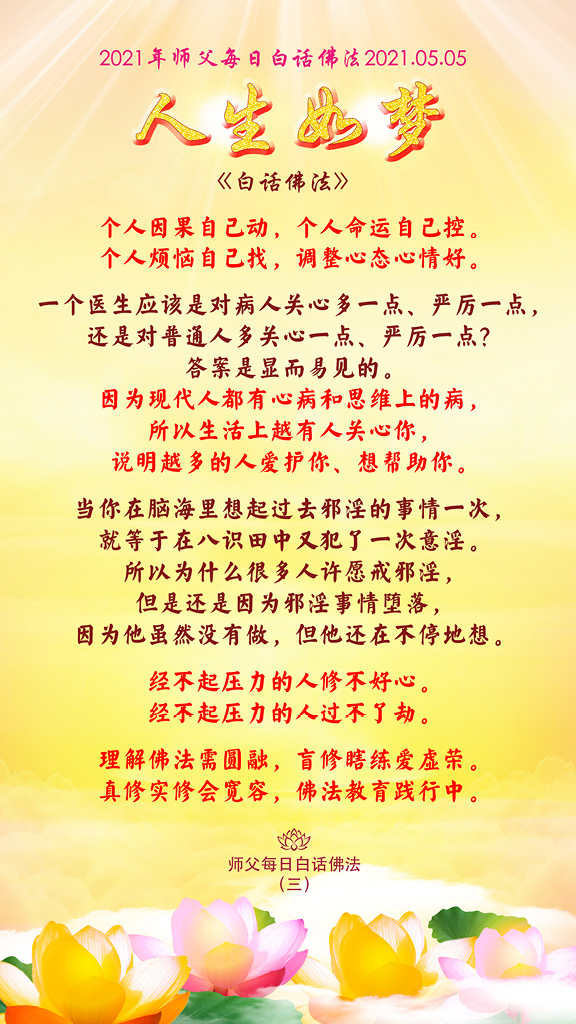 犹如医院里面,这么多人都生病,为什么医生不得病?为什么社会上这么多人的弊病,修心人不能得?就是因为我们是修心人。