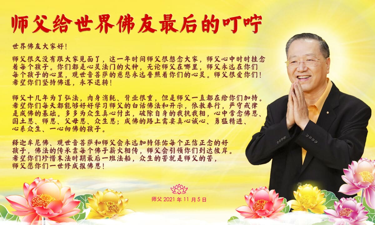 师父十几年为了弘法,肉身消耗、背业很重,但是师父一直都在给你们加持。希望你们每天都能够好好学习师父的白话佛法和开示,依教奉行,严守戒律是成佛的基础。多多为众生真心付出,破除自身的我执我相,心中常念佛恩、国土恩、师恩、父母恩、众生恩;成佛的路上需要真心诚心、勇猛精进、心系众生、一心向佛的孩子。