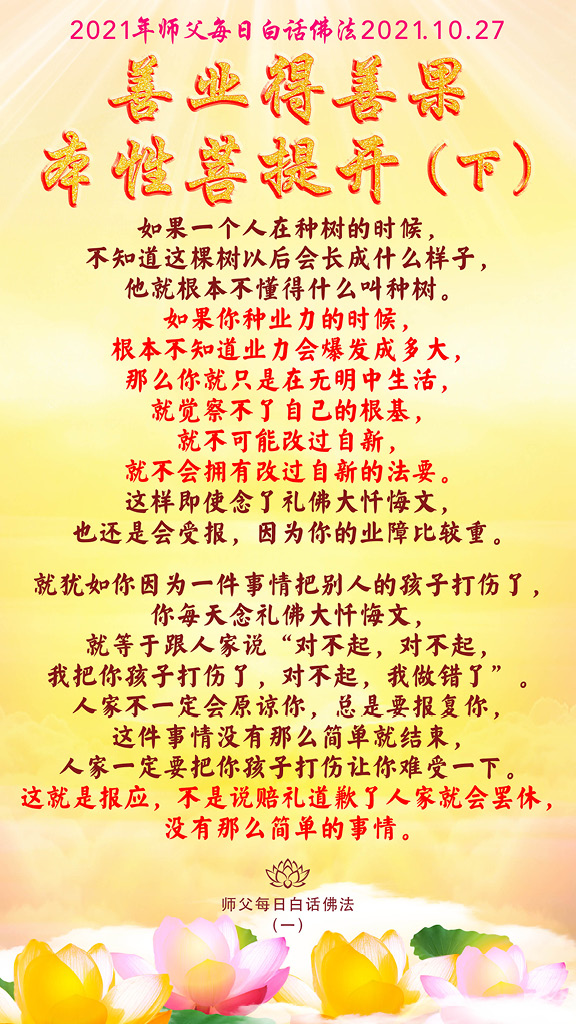 就犹如你因为一件事情把别人的孩子打伤了,你每天念礼佛大忏悔文,就等于跟人家说“对不起,对不起,我把你孩子打伤了,对不起,我做错了”。人家不一定会原谅你,总是要报复你,这件事情没有那么简单就结束,人家一定要把你孩子打伤让你难受一下。这就是报应,不是说赔礼道歉了人家就会罢休,没有那么简单的事情。念礼佛大忏悔文只是说“对不起”,心中知道做错了,并不代表你就改了。这件事情做错了,你到底改了没有?改是力量,如果没有力量在改,就算忏悔了,你对这件事情仍然没有更深的认识,以后还会重蹈覆辙。