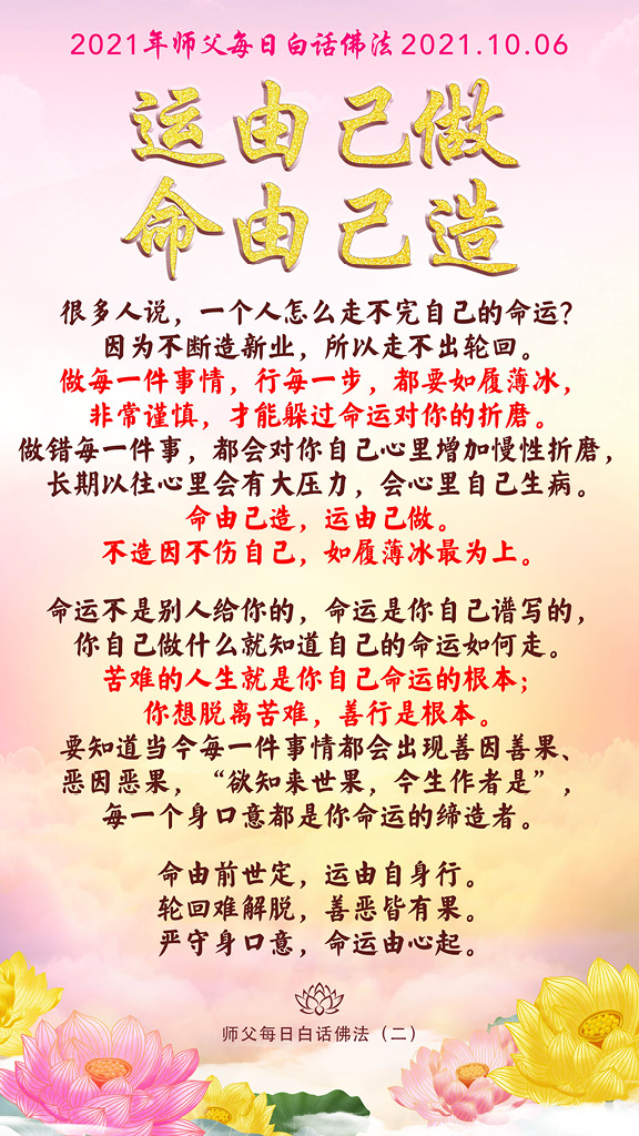 命运不是别人给你的,命运是你自己谱写的,你自己做什么就知道自己的命运如何走。苦难的人生就是你自己命运的根本;你想脱离苦难,善行是根本。要知道当今每一件事情都会出现善因善果、恶因恶果,“欲知来世果,今生作者是”,每一个身口意都是你命运的缔造者。
