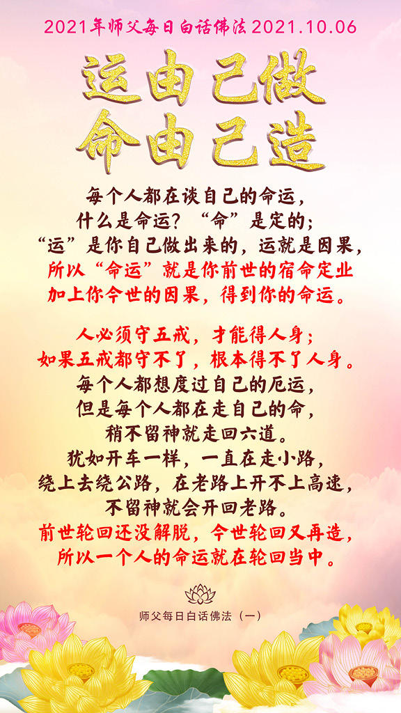 命运不是别人给你的,命运是你自己谱写的,你自己做什么就知道自己的命运如何走。苦难的人生就是你自己命运的根本;你想脱离苦难,善行是根本。要知道当今每一件事情都会出现善因善果、恶因恶果,“欲知来世果,今生作者是”,每一个身口意都是你命运的缔造者。