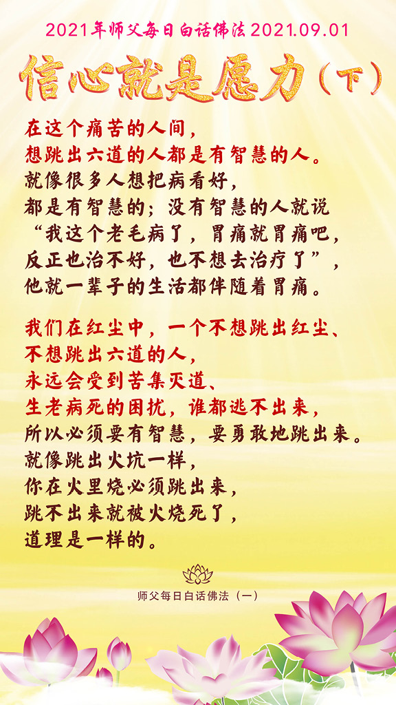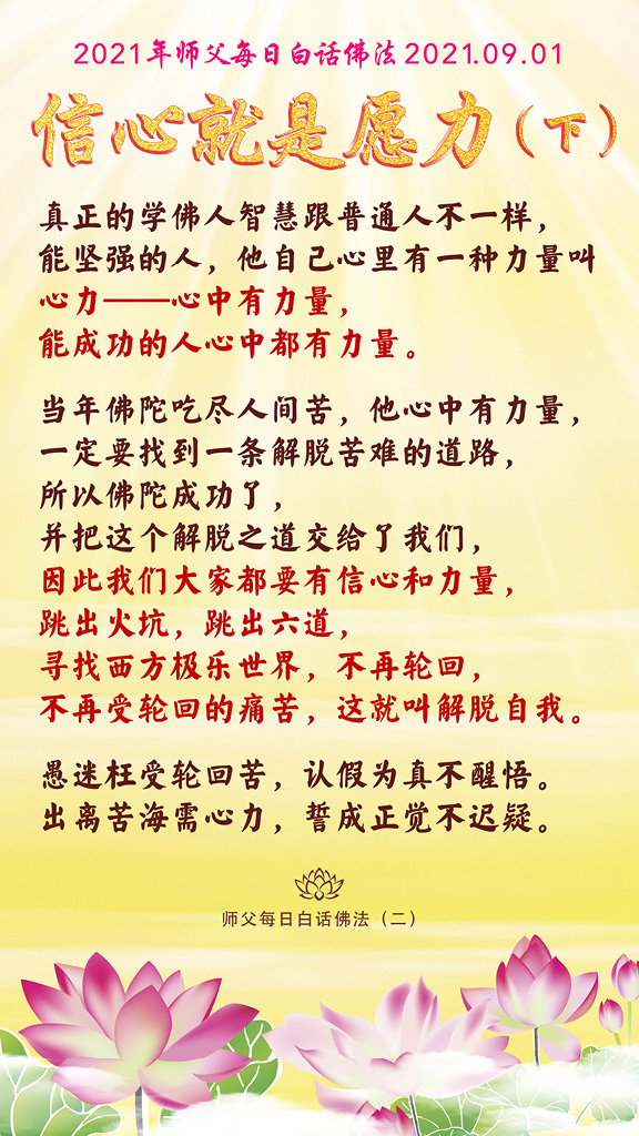 当年佛陀吃尽人间苦,他心中有力量,一定要找到一条解脱苦难的道路,所以佛陀成功了,并把这个解脱之道交给了我们,因此我们大家都要有信心和力量,跳出火坑,跳出六道,寻找西方极乐世界,不再轮回,不再受轮回的痛苦,这就叫解脱自我。